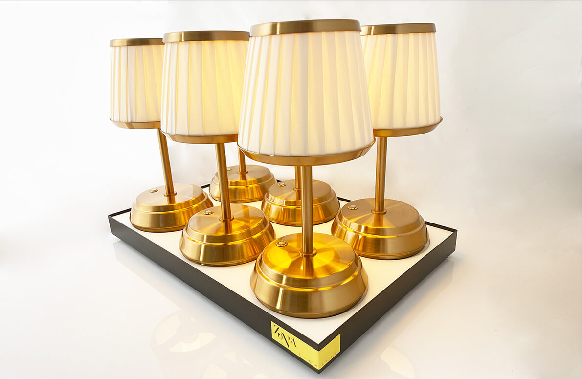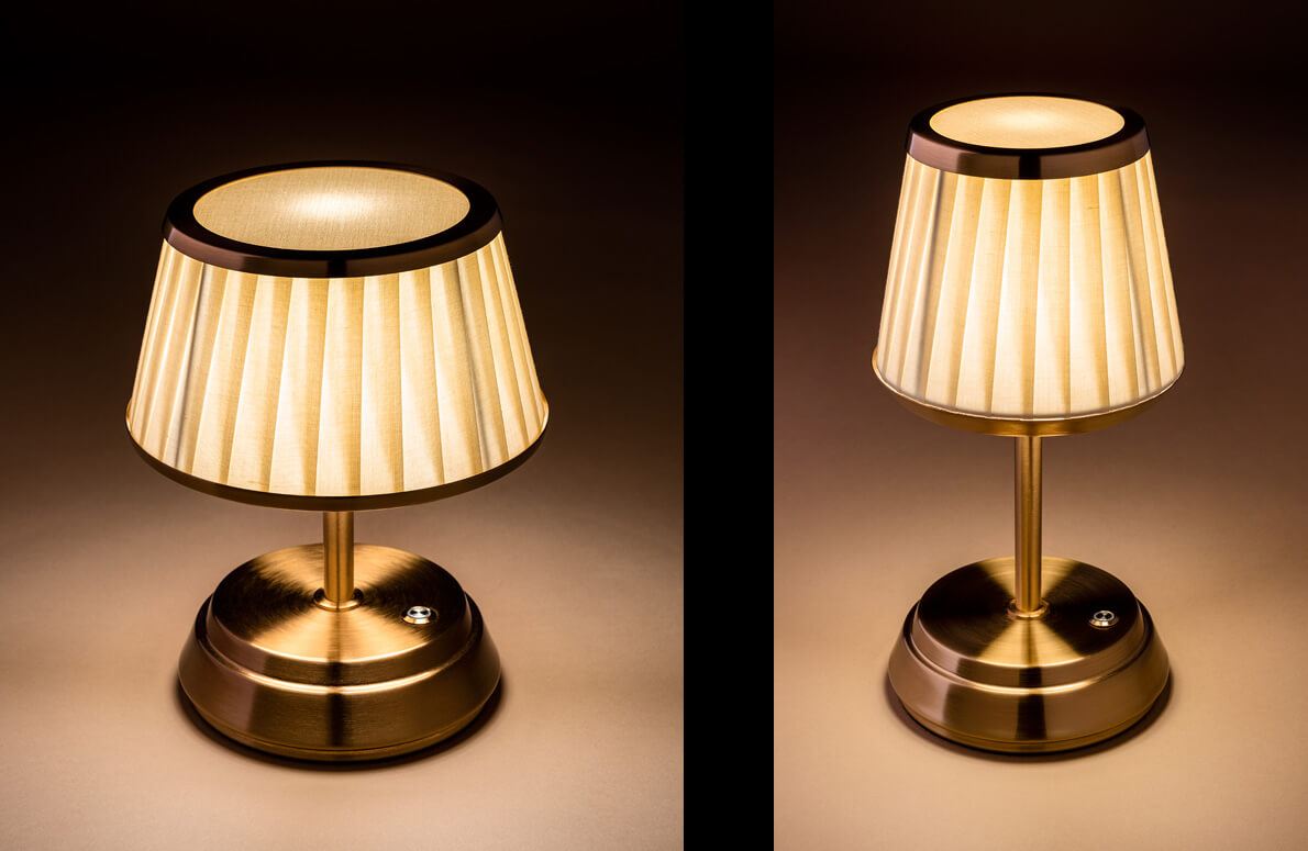 ZonKita è la lampada da tavolo a batteria Zonca Lighting, con finitura in ottone satinato e paralume avorio plissé. Il suo LED a 3.5 W può essere regolato su tre livelli di luminosità.
