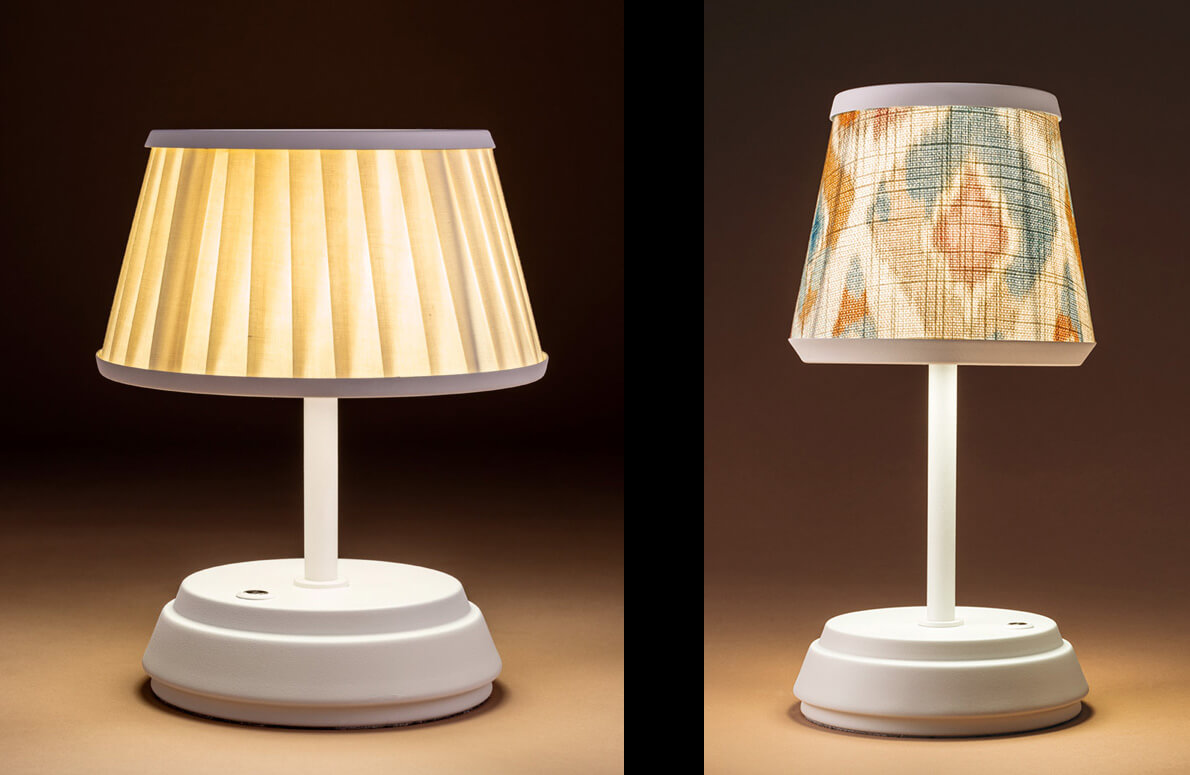 Su richiesta, Zonkita è personalizzabile in diverse finiture metalliche per i fusti e di tessuto per i paralumi.