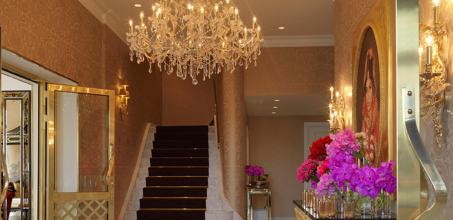 La scelta delle luci si intona ad un ambiente ricco di suggestioni. Ecco dunque alcuni fra i classici della collezione Zonca Lighting illuminare di charme gli ambienti: “Stellata” scende dall’alto per impreziosire la sontuosa meeting room, “Imperatrice” – lampadario in cristallo con rifiniture in oro – accoglie gli ospiti all’ingresso, mentre “Settecento“ – applique a candelabro – valorizza le pareti con il suo stile ricercato.